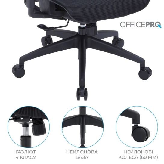 Кресло установлено на крепкой нейлоновой базе с колесами размером 60 мм, что обеспечивает стабильность и плавность перемещения. Officepro Wave – идеальный выбор для тех, кто ценит комфорт, качество и современный дизайн.