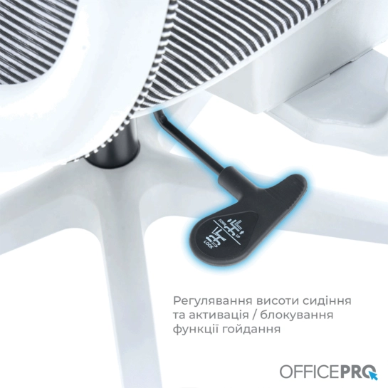 Кресло имеет нейлоновые 3D-подлокотники, обитые мягким полиуретаном, которые регулируются по высоте, вперед-назад, а также по горизонтали. Синхронный механизм наклона (синхромеханизм) позволяет фиксировать спинку в трех положениях, а функция регулировки высоты сиденья и качания обеспечивает дополнительные возможности персонализации во время работы.