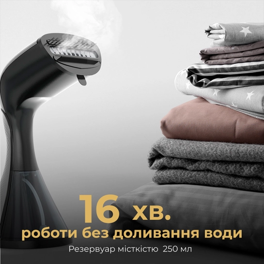 Резервуар для воды емкостью 250 мл позволяет отпаривать одежду в течение 16 мин без перерыва.