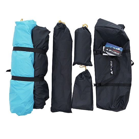 В комплекте вместе с палаткой предусмотрен чехол, который выполняет функцию герметичного мешка. Также в комплекте предусмотрены заплатки на случай прокола изделия. Килочки укреплены для большей надежности. Внутри предусмотрели специальный крючок, чтобы можно было повесить лампу или фонарь. В комплект вошли: сумка для хранения килочек, ветровые веревки, пряжка, ремонтная трубка шеста.