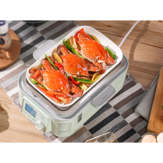 Этот универсальный прибор имеет двойной стеклянный сотейник, идеально подходящий для медленного приготовления насыщенных рагу и супов, эффективно сохраняя тепло. Двухслойная решетка позволяет готовить несколько блюд на пару одновременно, повышая эффективность и экономя ваше время. В комплекте также имеется специальный керамический поддон для приготовления рыбы на пару, гарантирующий равномерное распределение тепла, сохраняя нежный вкус и текстуру ваших морепродуктов.