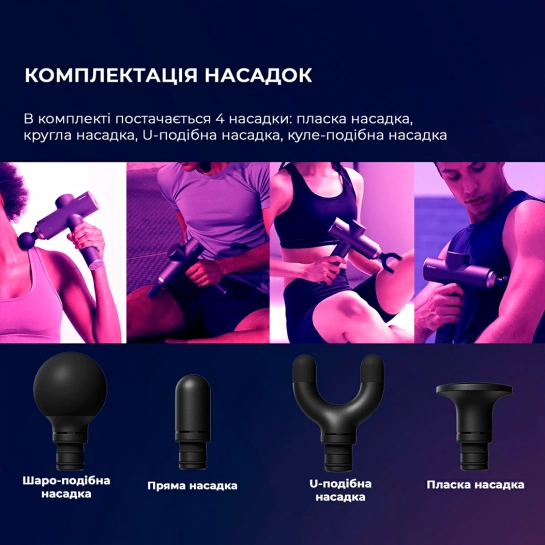 В комплекте с массажером идут 4 насадки, поэтому вы точно сможете выбрать наиболее подходящую в конкретном случае. Круглая (шариковая) насадка - наиболее универсальный вариант так как подойдет для массажа любых мышечных групп. Прямая насадка имеет более глубокое точечное проникновение ударных волн и используется для работы с триггерными точками и массажа стоп. Плоская насадка имеет минимальную глубину проникновения и идеально подходит для мышц спины, грудных и массажа стоп.