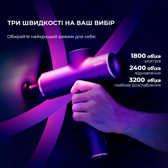 С помощью интуитивно понятной панели управления массажер YUNMAI Massage Gun Prime 2 можно переключать между тремя режимами скорости и двумя режимами массажа. 1800, 2400 или 3200 об/мин - вы точно сможете найти наиболее подходящий вариант для вас в нужный момент. Чем выше скорость, тем интенсивнее и глубже происходит массаж мышечной ткани и связок и тем выше его эффективность.