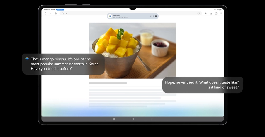 Используйте демонстрацию экрана на Galaxy Tab S11 Ultra, чтобы получать информацию в режиме реального времени с помощью Gemini Live. Просто нажмите и удерживайте боковую клавишу, чтобы начать, и демонстрируйте экран Google Gemini — и задавайте свои вопросы. Gemini может даже сам задавать встречные вопросы, поддерживая непринужденную беседу, которая поможет найти нужные ответы.