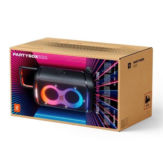 Колонка JBL PartyBox 520 изготовлена с использованием переработанного пластика. А упаковка сделана из бумаги, сертифицированной FSC с печатью соевыми чернилами.