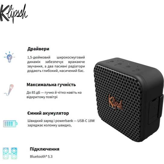 Характеристики для Портативная акустика Klipsch Austin Bluetooth Black (1072094)