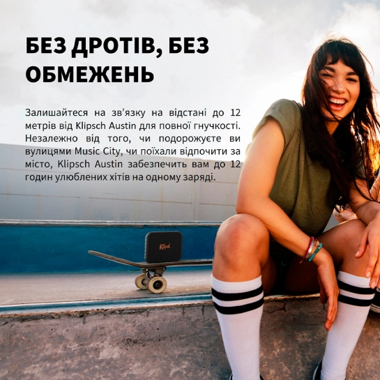 Klipsch Austin — компактная, но одновременно мощная портативная колонка, которая обеспечивает чистый звук и глубокие басы. Прочная, водонепроницаемая и с длительным временем автономная работа, она идеально подходит для ежедневных приключений в городе и на природе.