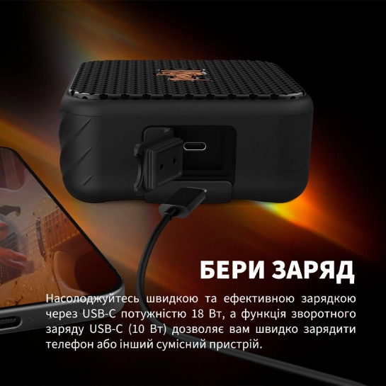 Быстрая зарядка по USB-C мощностью 18 Вт обеспечивает готовность колонки даже при плотном графике.