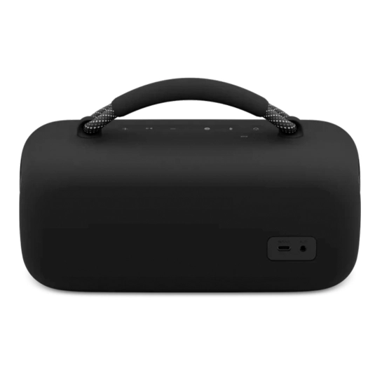 - Компактная конструкция с удобной ручкой, выполненной из уникальной мягкой веревки, позволяет легко переносить колонку на любую вечеринку.