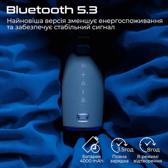 Устройство поддерживает беспроводную связь через Bluetooth версии 5.3 — это обеспечивает стабильную передачу сигнала на расстоянии до 10 метров без запаздываний. Кроме того, реализована функция TWS (True Wireless Stereo): вы можете пары такие же колонки Gravity для получения стереоэффекта и более широкого звукового поля. Контроль над музыкой реализован с помощью сенсорных кнопок на корпусе: переключение треков, регулировка громкости и воспроизведение становятся лёгкими и интуитивными.