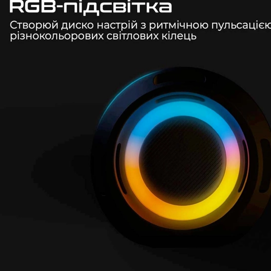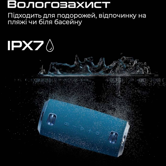Колонка имеет степень защиты от воды по стандарту IPX7 — это значит, что устройство выдержит погружение в воду до 1 метра на короткое время, и вы спокойно можете использовать его у бассейна или на пляже. Дополнительно встроена RGB-подсветка, создающая атмосферу вечеринки: динамичная световая индикация реагирует на ритм музыки и подчёркивает настроение.
