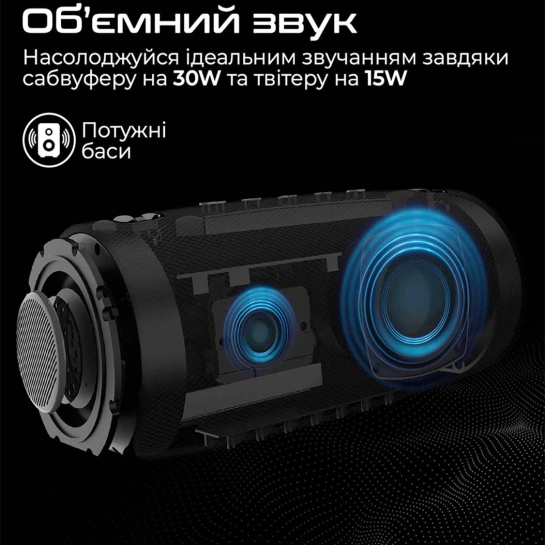 Колонка оснащена двумя динамиками: 30 Вт (вуфер) + 15 Вт (твитер), что в сумме даёт мощность около 45 Вт — достаточно, чтобы наполнить среднюю комнату чистым звуком и плотным басом. Благодаря этому вы получите насыщенный звук с чёткой серединой и выразительными высокими частотами, без лишнего шума и искажений.