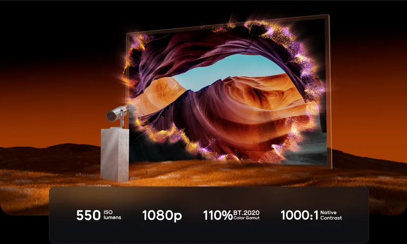 - Мощность тройного лазера: благодаря технологии тройного лазера наслаждайтесь впечатляющими визуальными эффектами с яркостью 550 ISO люмен, цветовой гаммой 110% BT. 2020 и контрастностью 1000:1, что обеспечивает яркие белые, глубокие черные и впечатляющую четкость цветов на 120-дюймовом экране.