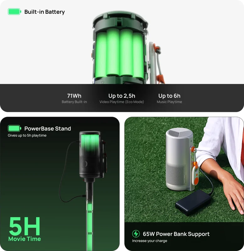 - Встроенный аккумулятор для бесконечного развлечения: возьмите развлечения на большом экране куда угодно с временем воспроизведения до 2,5 часов — идеально для незабываемых поездок на кемпинг. Совместите его с нашей подставкой PowerBase Stand для продления просмотра до 5 часов.
