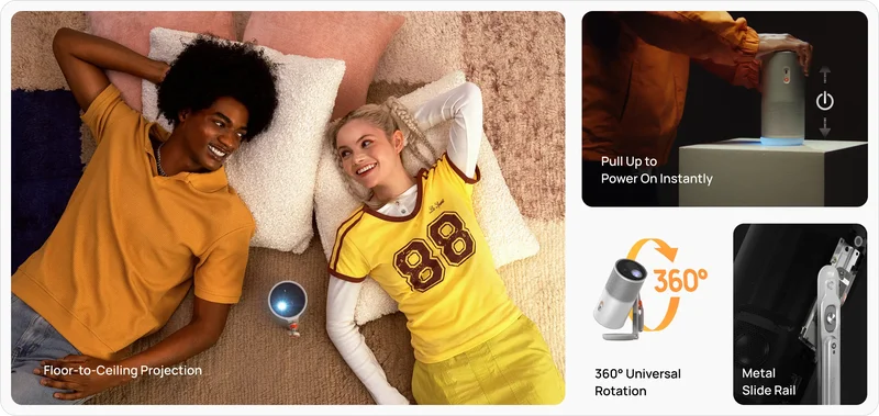 - Встроенная подставка с возможностью регулировки на 360°: благодаря универсальной подставке с возможностью регулировки на 360° и технологии ISA, MoGo 4 Laser автоматически выравнивает и настраивает изображение для идеального просмотра под любым углом. Проецируйте изображение на любую поверхность, от пола до потолка, и наслаждайтесь любимыми фильмами по своему вкусу.