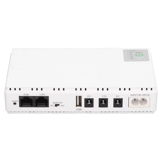 Цей UPS оснащений функцією POE (Power over Ethernet), що дозволяє передавати електроенергію через роз'єм RJ45 з напругою 15 і 24 В. Це особливо зручно для живлення пристроїв, які розташовані поза приміщенням, без необхідності прокладати додаткові кабелі. При підключенні через POE швидкість передачі становить 100 Mbps. Крім того, цей пристрій підтримує кілька варіантів вихідної напруги та струму: POE: 24V/0.6A, POE: 15V/0.6A, DC: 12V/1A, DC: 9V/1A, DC: 5V/2A, та USB: 5V/2A.