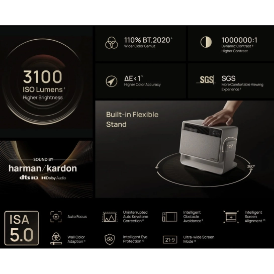 Наша передовая технология Intelligent Screen Adaption (ISA) 5.0 позволяет сократить время настройки и больше времени проводить за просмотром. Умные функции, такие как Wall Color Adaption, автоматически оптимизируют проекцию для любой поверхности, максимально увеличивая время вашего отдыха.