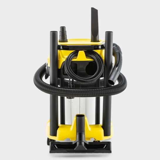 Энергоэффективный аппарат WD 3 PS V-17/4/20 развивает высокую мощность всасывания при низкой потребляемой мощности (лишь 1000 Вт). При этом он сочетается с всасывающим шлангом и снабженной насадкой для пола, благодаря чему обеспечивается превосходный результат сбора любого мусора – сухого или влажного, крупного или мелкого. Этот бытовой пылесос впечатляет своей компактностью, оснащен прочным 17-литровым мусоросборником из нержавеющей стали, 4-метровым кабелем, 2-метровым всасывающим шлангом и мешком-фильтром из нетканого материала. Благодаря неразборному патронному фильтру он позволяет чередовать операции влажной и сухой уборки без замены фильтра. Встроенная штепсельная розетка с автоматикой включения/выключения предусматривает подключение к нему электроинструментов (лобзики, шлифовальные машины и т. д.) для мгновенного сбора пыли и стружек, образующихся при выполнении работ с ними. Функция выдувания значительно влияет на очистку труднодоступных мест. Для компактного хранения шланг подвешивается на моторной части, кабель – на специальном крючке, а удлинительные трубки и насадка для пола закрепляются на отбойнике. Замки Pull & Push позволяют очень легко присоединять и отсоединять мусоросборник. Рукоятка может снять всасывающий шланг для прикрепления насадки непосредственно к ней.