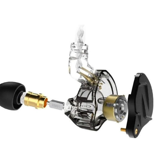 Корпуса наушников изготовлены из сочетания полупрозрачного пластика и цинкового сплава, окрашенного в эффектный черный цвет. Примечательно, что не только фейсплейты, но и звуководы окрашены в черный, что в комплексе создает приятную эстетическую композицию. Стоит также отметить, что рассматриваемые наушники, помимо оригинального дизайна, могут похвалиться и удобством ношения, чего заслуга анатомической формы и умеренных габаритов чаш. Что касается применяемого кабеля, то здесь снова производитель заслужил высоких оценок, ведь ZSN PRO X укомплектованы более изящным (по сравнению с предыдущими моделями KZ) плетеным профилем, выполненным из посеребренной меди. Подобранные заушины – статичные (без эффекта памяти); коннекторы – 2-пин; аудиоджек – 3.5-мм, L-образный.