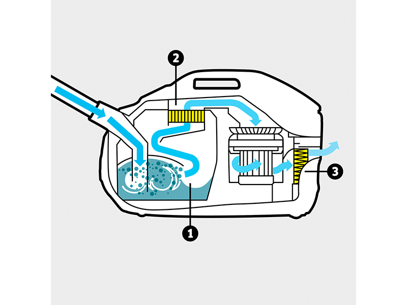 Многоступенчатая система фильтрации включает в себя инновационный аквафильтр, промежуточный фильтр и фильтр HEPA 13 (EN 1822: 1998)