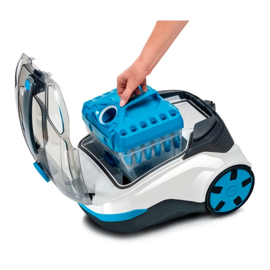 С системой фракционного разделения пыли. Имеет разные отсеки для крупного мусора и мелкой пыли. Постоянно готов к работе и не нуждается в регулярной очистке. Отлично подходит для быстрой уборки сухого мусора. Конструкция пылесборника позволяет легко и без пылевого выхлопа «спасти» случайно убранные предметы, н-р, детали детского конструктора.