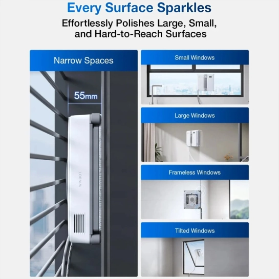 WINBOT MINI дает пользователям возможность контролировать процесс благодаря трем индивидуальным режимам мойки. Режим быстрой мойки эффективно очищает слегка загрязненные окна, режим тщательной уборки справляется с грязными окнами, а режим точечной мойки нацелен на конкретные участки с точной мойкой, идеально подходящей для борьбы с устойчивыми пятнами или птичьим пометом. Он позволяет направлять работа для мытья окон в 4 стороны – для тщательной и точной очистки сложных или загрязненных участков, требующих дополнительного внимания. Вы можете без труда получить блестящие окна, независимо от сложности задания