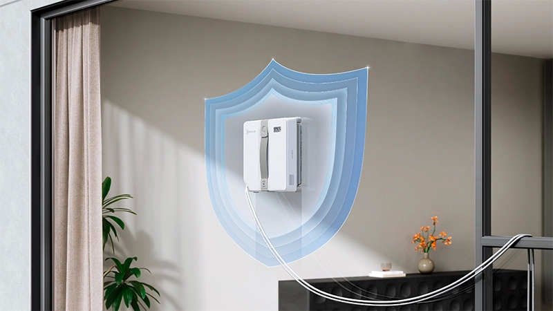 WINBOT MINI поднимает безопасность мойки окон на новую высоту благодаря 6 аппаратным средствам безопасности. Оптимальная сила всасывания 7500 Па обеспечивает крепкое прилегание к поверхности окна. Классическая конструкция щетки дает более плотное прилегание, что увеличивает стабильность. Запатентованная плавающая пластина стеклоочистителя защищает работу от внешних сил для надежного прилегания и минимизации трения. WINBOT MINI имеет автоматическую компенсацию давления воздуха, которая обнаруживает и компенсирует утечку воздуха всего за 0.04 секунды, поддерживая постоянное всасывание для непрерывной мойки. При отключении электроэнергии защита удерживает работа на окне более 30 минут, одновременно подавая звуковой сигнал тревоги. Также имеется крепкий нейлоново-латексный страховочный трос с прочностью на разрыв не менее 1900Н для дополнительного уровня безопасности