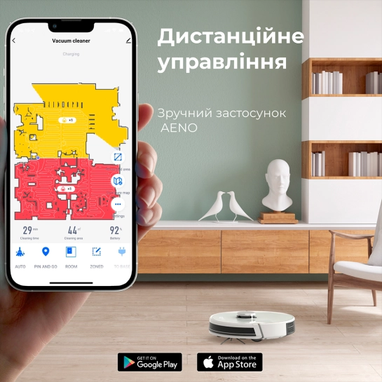 Управляйте пылесосом с помощью дистанционного пульта, приложения AENO или используя кнопки на панели.
