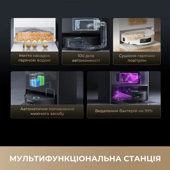 - Многофункциональная база со сбором мусора, мытьем и сушкой швабр
