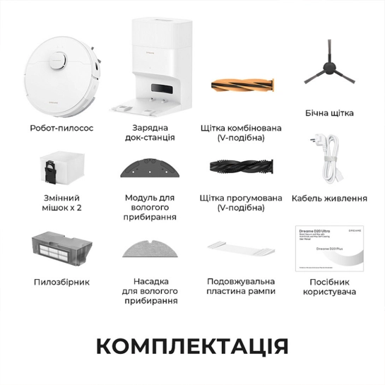 Насадка из микрофибры для влажной уборки, Кабель питания, Инструкция пользователя, Робот-пылесос с влажной уборкой, Гарантийный талон, Зарядная док-станция, Боковая щетка, Щетка прорезиненная (V-образная), Сменный мешок х 2, Щетка комбинированная (V-образная), Пылесборник, Модуль для влажной уборки