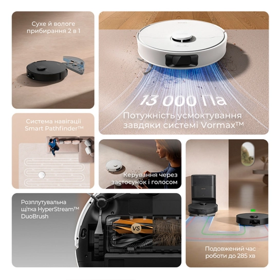Мощность всасывания 13000 Па позволяет освежать полы и ковры, не оставляя никаких шансов крошкам, мелкому мусору или шерсти домашних животных. D20 скользит от твердых полов до ковров, эффективно справляясь с трудновыводимыми загрязнениями и мусором, застрявшим в углах.