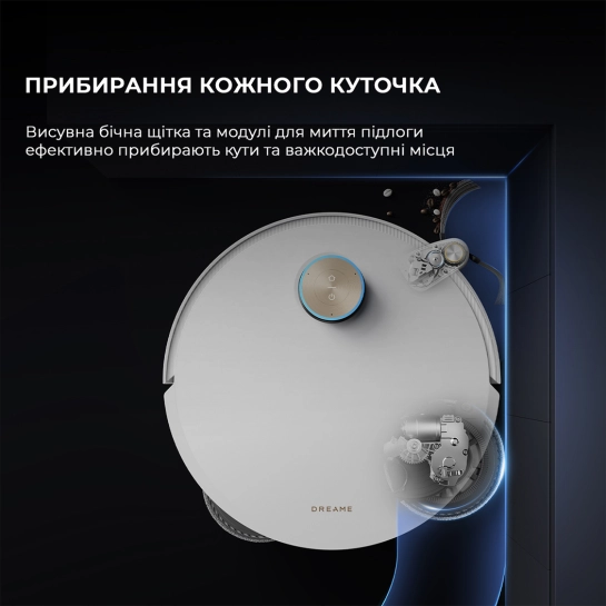 Выдвижная боковая щетка и швабра достигают всех щелей и углов, и областей под низкопрофильной мебелью, эффективно убирая каждую пылинку.
