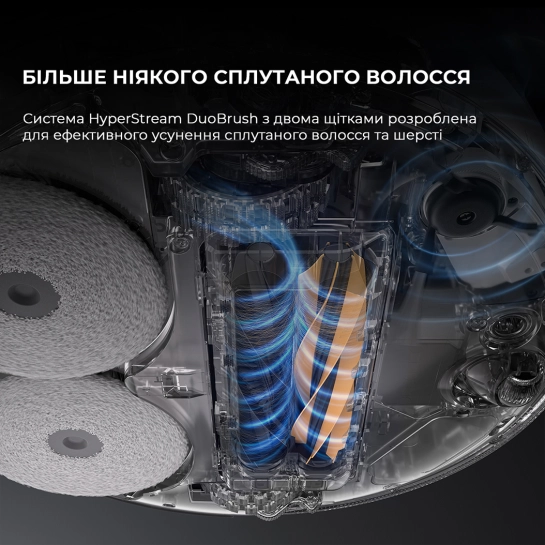 HyperStream DuoBrush с двумя щетками разработана для 100% устранения спутанных волос. Она без труда справится с прядями длиной до 30 см. Мощное всасывание в сочетании с резиновой щеткой со щетиной и резиновой щеткой из ТПУ обеспечивает эффективное удаление волос со всех видов полов сводя к минимуму шум и каждый раз обеспечивая тщательную и тихую уборку.