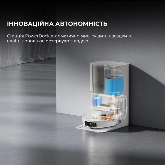 Наслаждайтесь легким обслуживанием с помощью станции PowerDock без помощи рук с самоочисткой, сушкой насадок для швабр горячим воздухом и многим другим. Совместимый с комплектом WaterHookup Kit, робот-пылесос также наполняет и сливает воду, сводя ручное обслуживание практически к нулю.