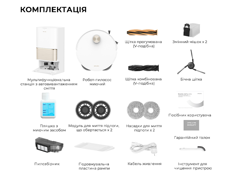 Боковая щетка, Бутылка с моющим средством, Вращающийся модуль для мойки пола х 2, Гарантийный талон, Инструмент для чистки устройства, Кабель питания, Мультифункциональная станция с автовыгрузкой мусора, Насадки для мойки пола х 2, Пылесборник, Робот-пылесос моющий, Руководство пользователя, Сменный мешок х 2, Удлинительная пластина рампы, Щетка комбинированная (V-образная), Щетка прорезиненная (V-образная)