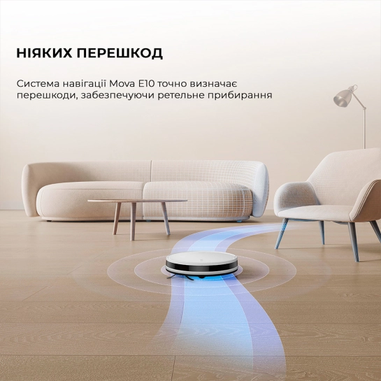 Благодаря системе навигации Mova E10 точно определяет препятствия и плавно их объезжает, обеспечивая тщательную уборку. Кроме того, этот пылесос без труда преодолевает пороги высотой до 1,5 см, что позволяет ему заехать даже на ворсистый ковер.