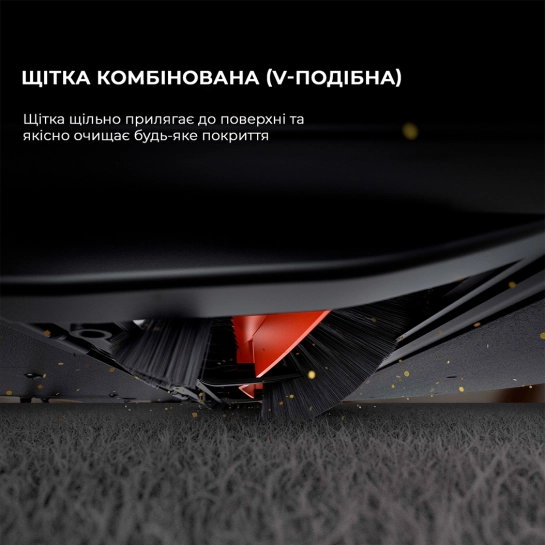 Основная V-образная турбощетка в процессе уборки плотно прилегает к поверхности, за счет чего качественно очищает покрытия.