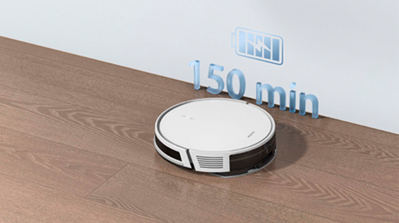 Аккумулятором емкостью 2600 мАч обеспечивает до 150 мин автономной работы, этого времени достаточно для уборки площади до 120 кв. м. При низком заряде батареи, робот-пылесос автоматически возвращается на док-станцию и восстановив энергию, возобновляет уборку с того же места, где остановился.