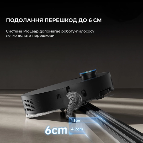 Система ProLeap помогает плавно преодолевать препятствия высотой до 6 см, благодаря системе поглощающей удары для обеспечения тихой уборки. Она ловко поднимает роботизированные выдвижные ножки, что позволяет легко пересекать дверные направляющие, двухслойные пороги и убирать вокруг U-образной мебели без повреждений.