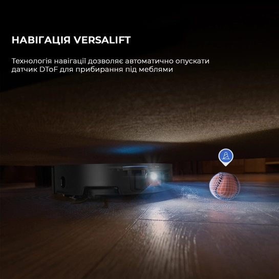 Пылесос X50 Ultra улучшает работу датчика сканирования на 360 градусов, создавая подробную карту без слепых зон для точной навигации без ненужного вращения. Технология навигации VersaLift интеллектуально втягивает датчик DTof, когда пылесос двигается под мебелью.