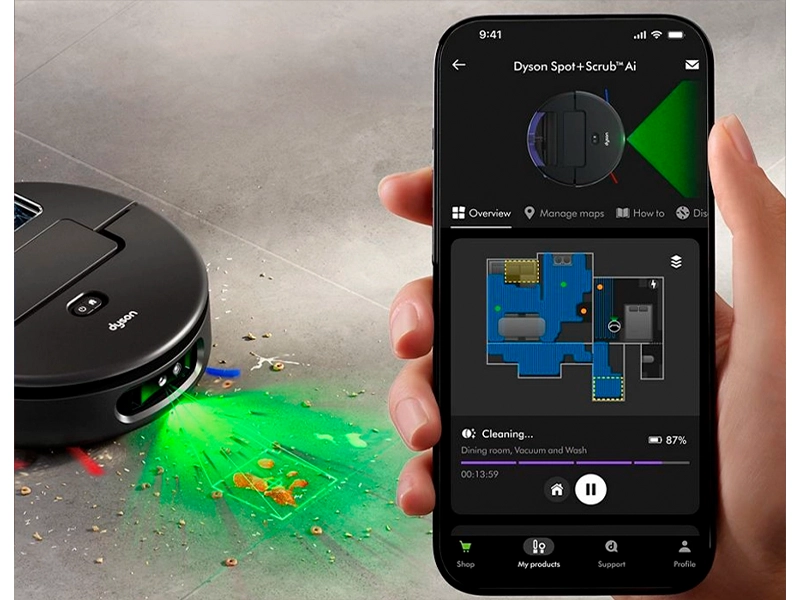 Робот-пылесос Dyson Spot+Scrub Ai способен автоматически обнаруживать пятна и разливы и эффективно их очищать с помощью искусственного интеллекта. Для особо стойких загрязнений устройство обрабатывает одну и ту же область несколько раз, гарантируя полное удаление грязи без следов.
