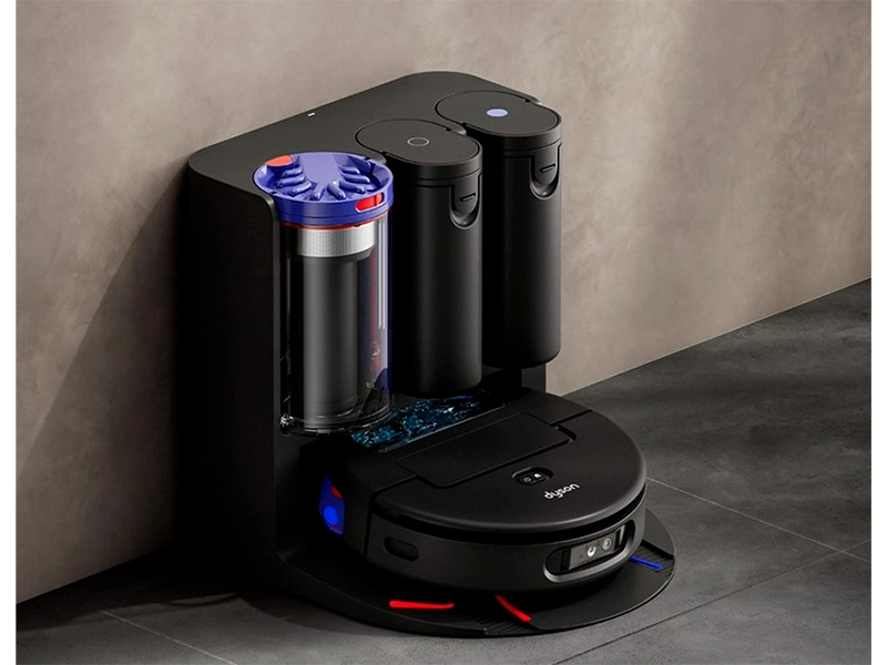 Станция Dyson обеспечивает автоматическое опорожнение, самоочистку, дозирование моющего раствора и подзарядку устройства, поддерживая его в постоянной готовности.