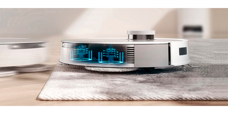 Кроме того, эти режимы можно распределять по пространству в зависимости от покрытия (к примеру обильное смачивание на плитке, и слабое на ламинате) или других условий. На коврах робот самостоятельно поднимает моющие диски, так что можно пылесосить их одновременно с мойкой пола.