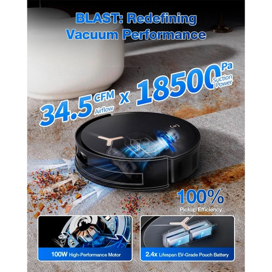 Эффективная уборка зависит не только от силы всасывания. Благодаря новому революционному решению BLAST (Boosted Large-Air Flow Suction Technology), DEEBOT T50 MAX PRO OMNI переосмысливает действительно эффективную уборку, балансируя максимальный поток воздуха с достаточной силой всасывания. Его двигатель мощностью 100 Вт с высоким крутящим моментом совмещает на 45% большие лопасти вентилятора с конструкцией с низким сопротивлением. Работает на литий-полимерном элементе со стабильной и надежной работой, достигает беспрецедентного потока воздуха 17 л/с и достаточной силы всасывания 18 500 Па. Это увеличивает эффективность уборки мелкой пыли в коврах на 78%. Он также эффективно улавливает тяжелые частицы грязи и мусора как на жестких полах, так и на коврах со 100% коэффициентом уборки.