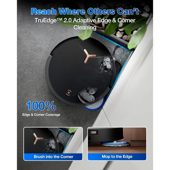 DEEBOT T50 MAX PRO OMNI достигает 100% покрытия уборки благодаря TruEdge 2.0. Благодаря своей двойной выдвижной конструкции – выдвижной боковой щетке спереди и непрерывно регулируемой швабре сзади – DEEBOT достигает глубоких углов и краев. Интеллектуальная боковая щетка автоматически выдвигается, чтобы добраться глубоко до узких мест, не оставляя после себя пыли или грязи. Непрерывно регулируемая швабра всегда остается близко к краям и углам, даже при повороте. Эта интеллектуальная адаптивная система очистки обеспечивает тщательную уборку в отличие от других роботов, которые могут пропустить пятна вдоль краев и в углах.