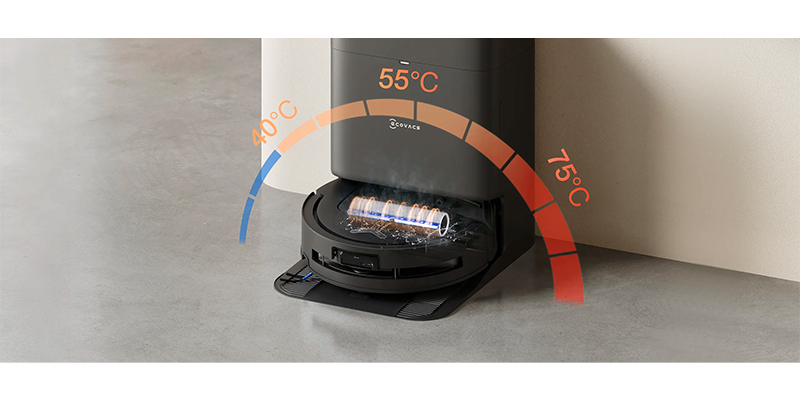 Система сушки горячим воздухом 45°C включает в себя механизм сушки с вращением на 360° для ролика, с горячим воздухом, точно направленным и сконцентрированным на одной стороне. Всего за два часа эта система обеспечивает полное высыхание швабры, эффективно предотвращая появление запахов.