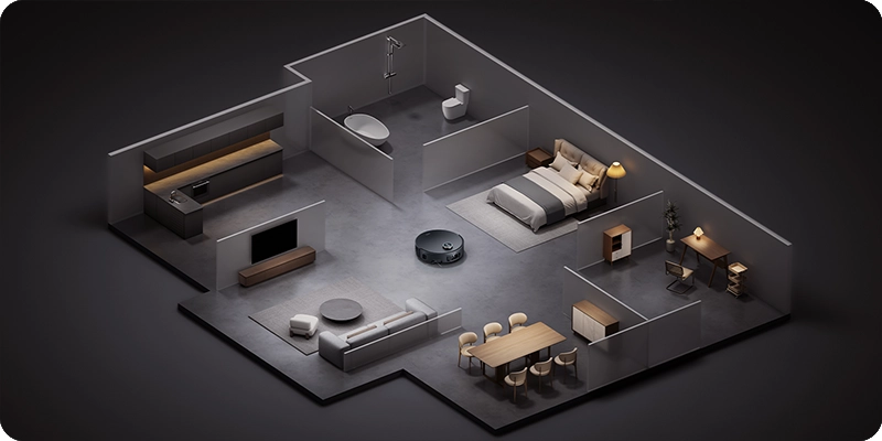 Высота корпуса робота — 96 мм, поэтому он может заезжать под большинство кроватей и диванов. Однако главная «фишка» навигации — выдвижной датчик DToF. Он сканирует пространство на 360°, но когда робот заезжает в узкие места под низкой мебелью, система адаптируется, чтобы избежать столкновений. Лазерная технология строит карту уже после первого проезда, распознавая даже мелкие объекты на полу, такие как тапочки или кабели, и аккуратно огибает их, не прекращая всасывание. Точное построение карты дает создавать сложные графики уборки для каждой комнаты отдельно, выбирая разную интенсивность мытья для кухни и спальни.