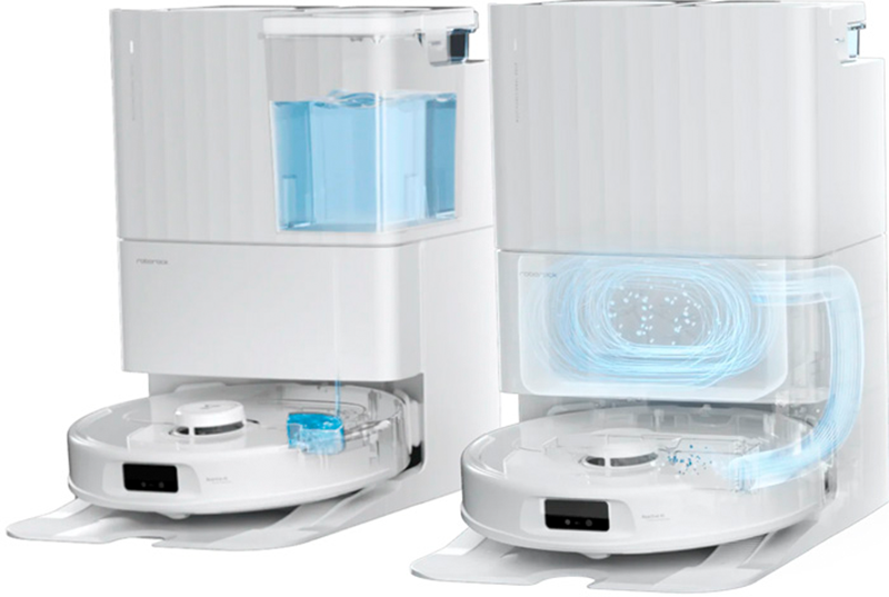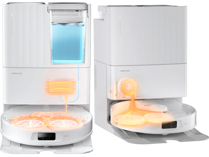 Когда робот полон, станция очищает пылесборник от мусора, когда осталось мало воды в баке, то пополняет недостающий объем жидкости. В процессе влажной уборки робот периодически заезжает на базу чтобы очистить моющие насадки, и вот тут уже есть пару новинок.