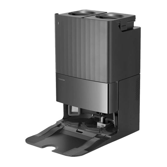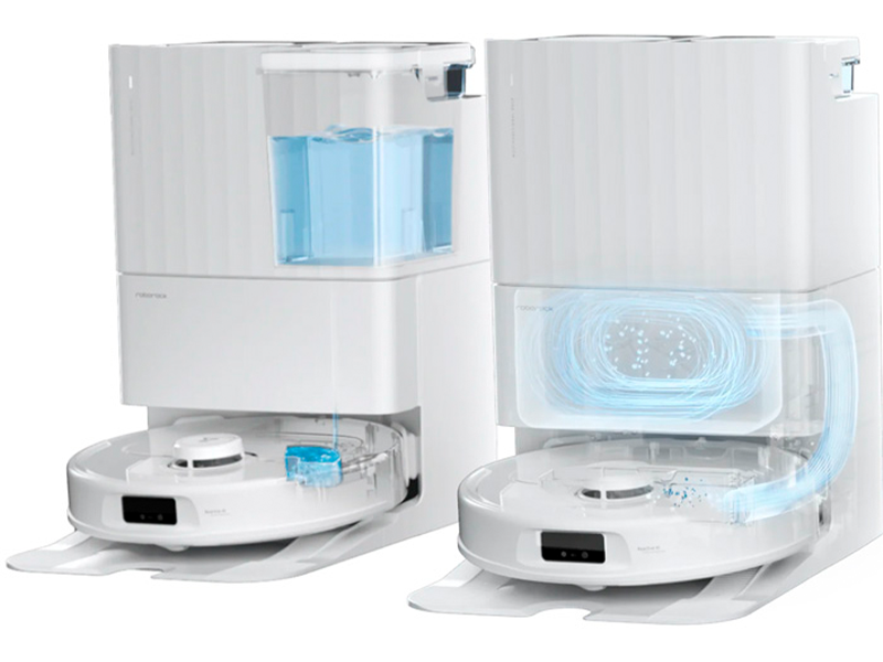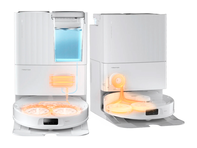Когда робот полон, станция очищает пылесборник от мусора, когда осталось мало воды в баке, то пополняет недостающий объем жидкости. В процессе влажной уборки робот периодически заезжает на базу чтобы очистить моющие насадки, и вот тут уже есть пару новинок.