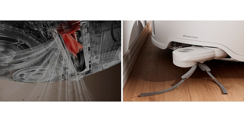 Благодаря технологии FlexiArm правое чистящее колесо выезжает за пределы корпуса, что помогает качественно вымыть пол вплотную к стенам, плинтусам, не оставляя слепых зон.